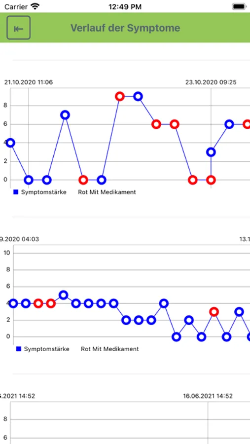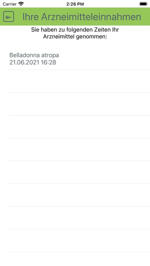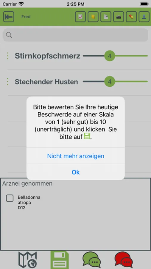 Verordnet Ihr Therapeut Ihnen ein Mittel, gibt es die Erinnerungsfunktion. Ihr Mobilgerät erinnert Sie an die Einnahme des Mittels und gleichzeitig haben Sie die Möglichkeit, die Stärke Ihrer Symptome auf einer Skala von 1-10 zu bewerten.