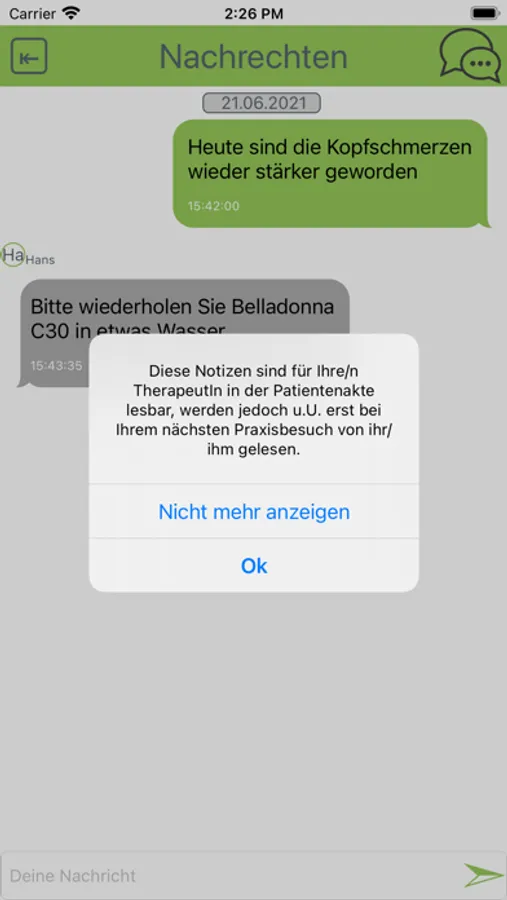 Wenn Sie etwas für erwähnenswert halten, schreiben Sie dem Therapeuten eine Nachricht. Diese Nachricht sieht er dann direkt in Ihrer Krankenakte bei Ihrem nächsten Termin vor Ort. Treten Notfälle ein, können Sie Ihren Therapeuten mit hoher Priorität unmittelbar kontaktieren.