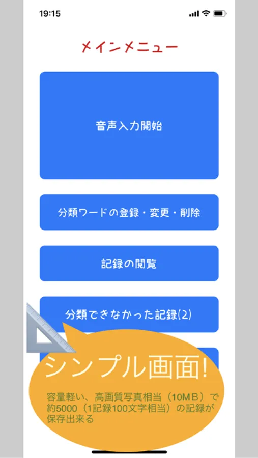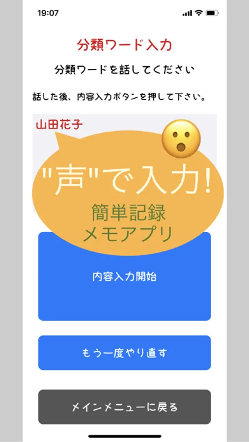 2.メインメニューの「音声入力ボタン」をタップします。そして「分類ワード」を話します。