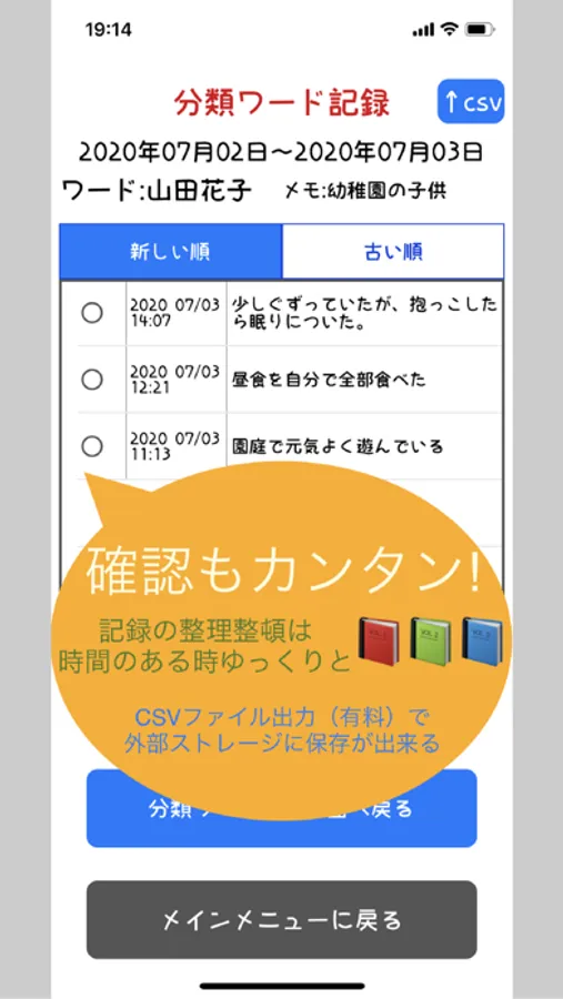 ●有料(1200円前後)「CSVファイル」は、iOS純正の「ファイルアプリ」に出力されます。出力の都度、ファイルは上書き保存されます。出力項目は「時間」「分類ワード」「メモ」「内容」「使用者」の5つになります。