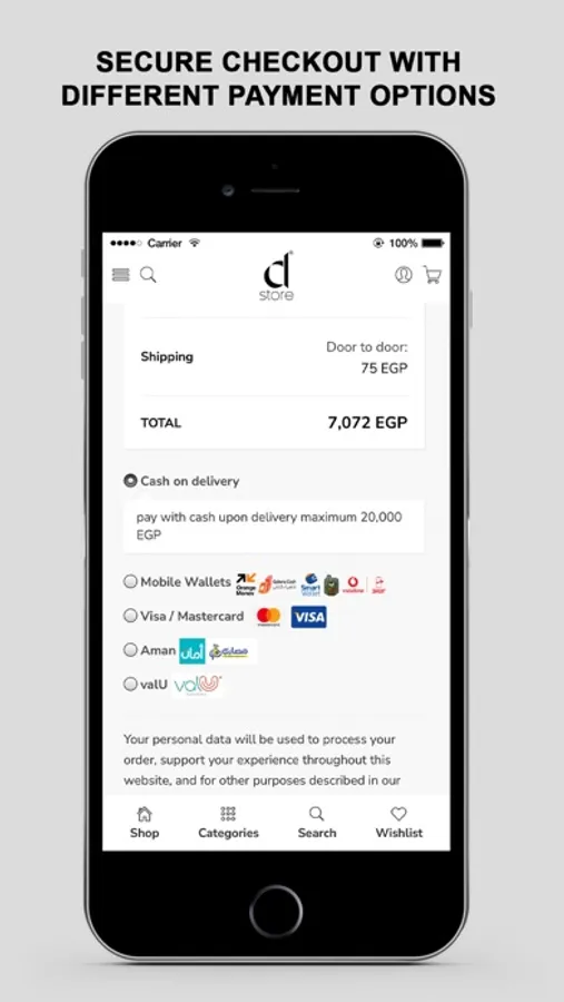 You can choose to pay with cash-on-delivery, with card, your mobile wallet or with an installment plan. All are available for a simple check out process.