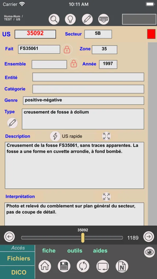 Le logiciel fonctionne aussi bien en Wifi qu’en 3G/4G. Huit fichiers sont actuellement implantés dans iSyslatPro2: les fichiers US, FAIT et ENS pour la gestion du terrain, PHOTO et DOC pour la gestion de la documentation photographique et graphique, MOBI, CER et TYPOCER pour la gestion du mobilier archéologique.