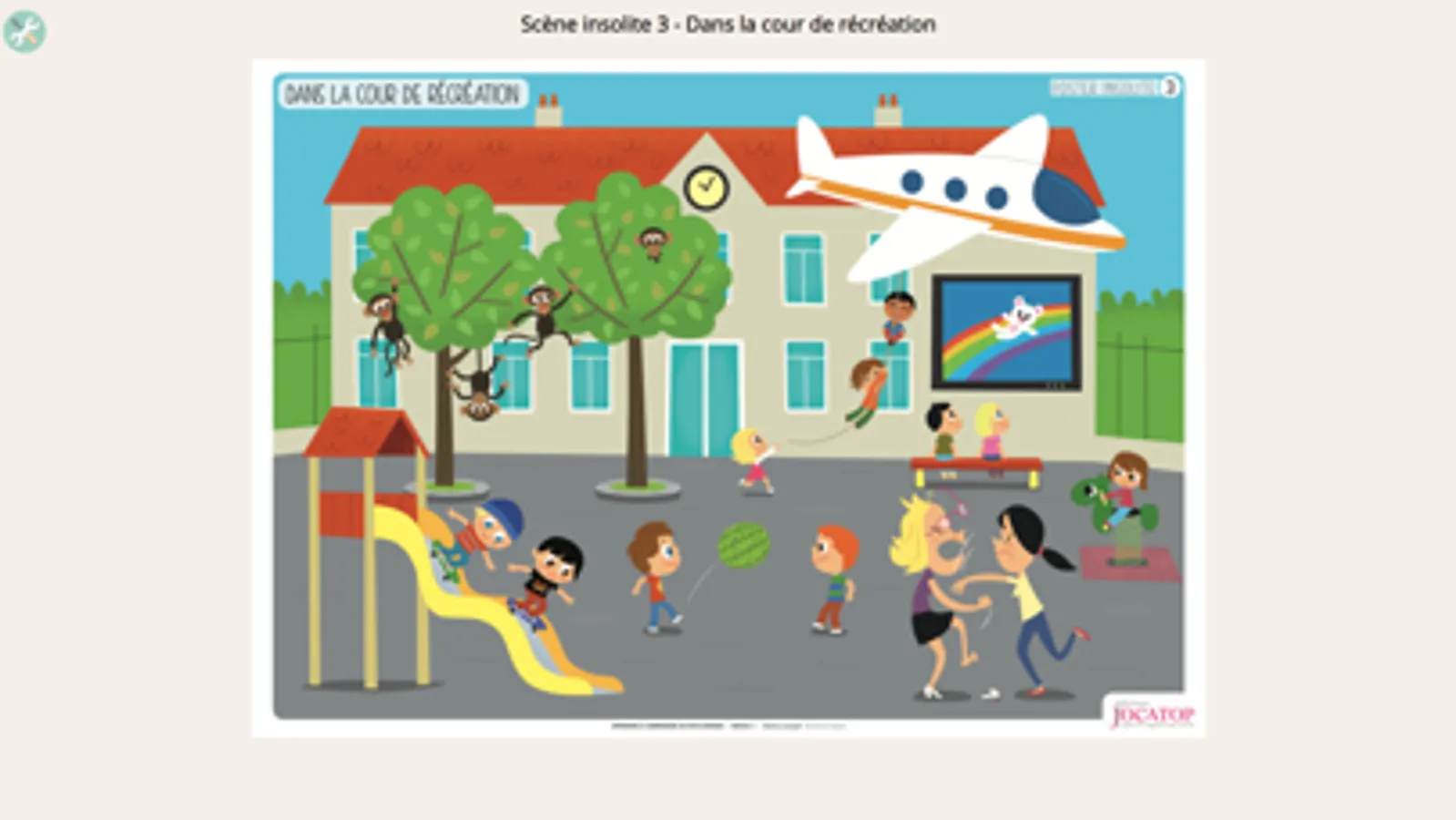 La première partie de cet ensemble pédagogique met à disposition des jeunes élèves des images insolites créées à partir d'environnements familiers (dans la classe, à la piscine, dans la salle de bains...). L'objectif est ici de faire la différence entre ce qui est insolite et ce qui ne l'est pas. L'élève doit expliquer, argumenter ses propositions, l'enseignant sera là pour l'aider à formuler ou à reformuler. Une autre série d'images amènera les élèves à comprendre l'implicite d'une situation. Cette première étape de travail se termine par la compréhension de textes courts (entre 3 et 5 lignes).