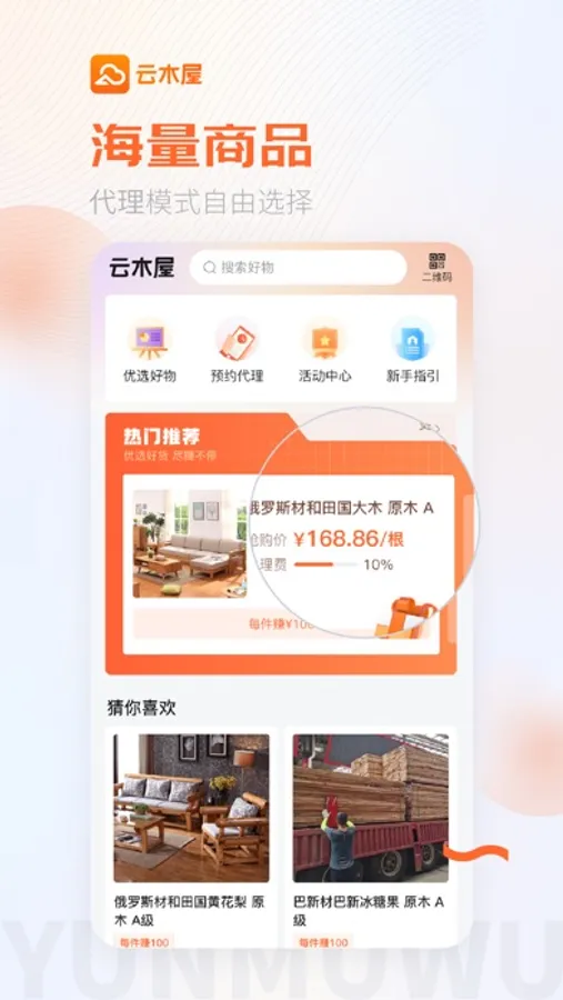 云木屋是基于解决传统木材行业供应链问题,而打造的一个优质、专业的木材代理平台。注册成为云木屋的用户,可获得优质商品的代理权。