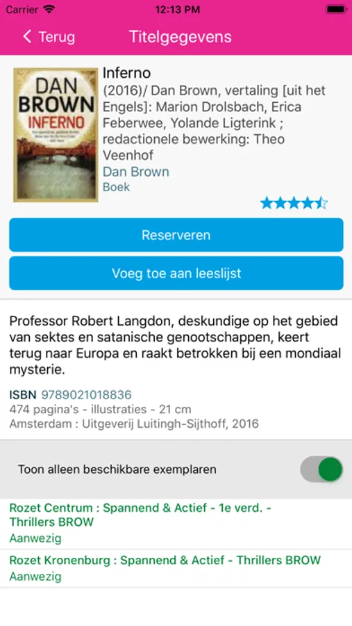 Gebruik de app om te zoeken en te reserveren in de collectie van Rozet Arnhem. Heb je een boek bij de hand, dan kun je door het scannen van de ISBN-barcode kijken of de bibliotheek het in bezit heeft. Je kunt materialen reserveren en je uitleningen verlengen. Verder geeft de app informatie over adressen en openingstijden van alle vestigingen en je kunt ze rechtstreeks bellen of e-mailen.