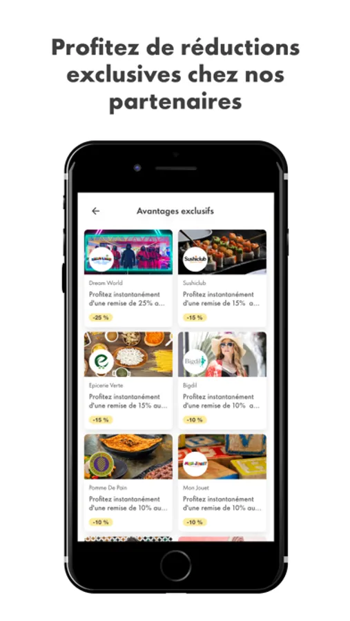 Inscrivez-vous gratuitement et bénéficiez immédiatement d’avantages et de réductions chez nos nombreux partenaires, simplement en présentant votre carte de fidélité virtuelle !
