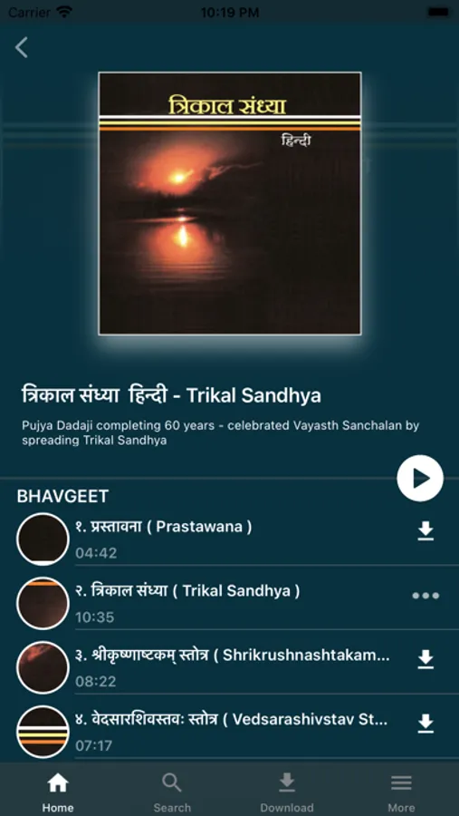 Jeevan Sampada is a religious trust inspired by Rev. Pandurangshastri Athavale (Pujaniya Dadaji), the founder of “Swadhyaya” the devotion based grassroots initiative. Over six decades, he has given thousands of discourses on Vedas, Upanishads and Shrimad Bhagwad Geeta. These discources have brought about positive transformation in cross section of the society. All the bhav geets are based on these discourses and “Sat Vichar Darshan” has the Copyright over them.