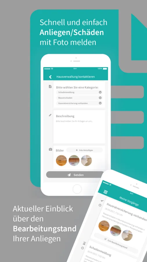 Als Mieter oder Eigentümer können Sie Schäden oder Anliegen direkt mit Fotos über unsere App melden. Ihre Anfragen stehen unseren Mitarbeiten dann zur Verfügung und können auch an Handwerksbetriebe weitergeleitet werden.