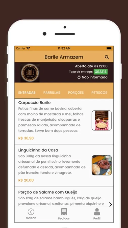 - cardápio ilustrativo, com preços dos produtos;