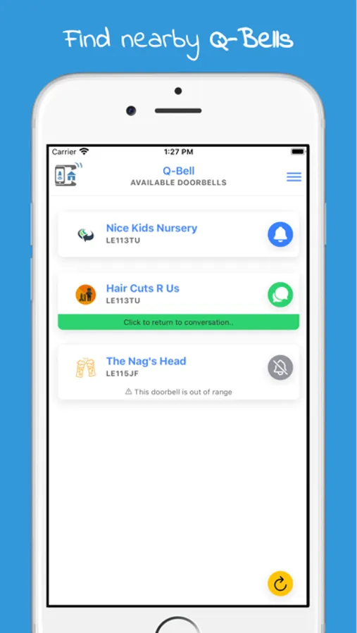 Q-Bell allows you to search for virtual doorbells at your current location, and ring the bell to alert the owner you are there without having to stand outside the door. The owner can then let you know when it is your turn to enter the premises or approach the door.