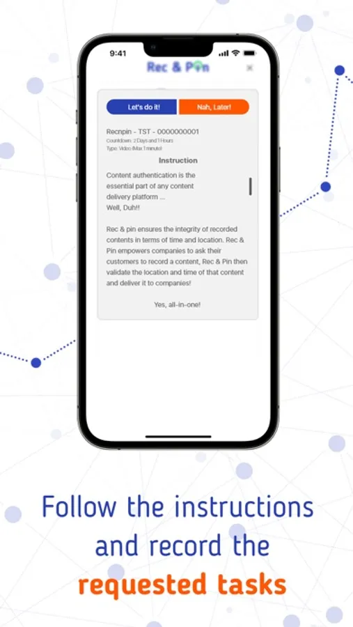Rec & Pin Console is an authenticated content delivery platform. This platform lets their users to send a task to their customers/employees to record content through Rec & Pin mobile app. Rec & Pin then verify the location and time of all contents and deliver it to the business! Isn't it cool?