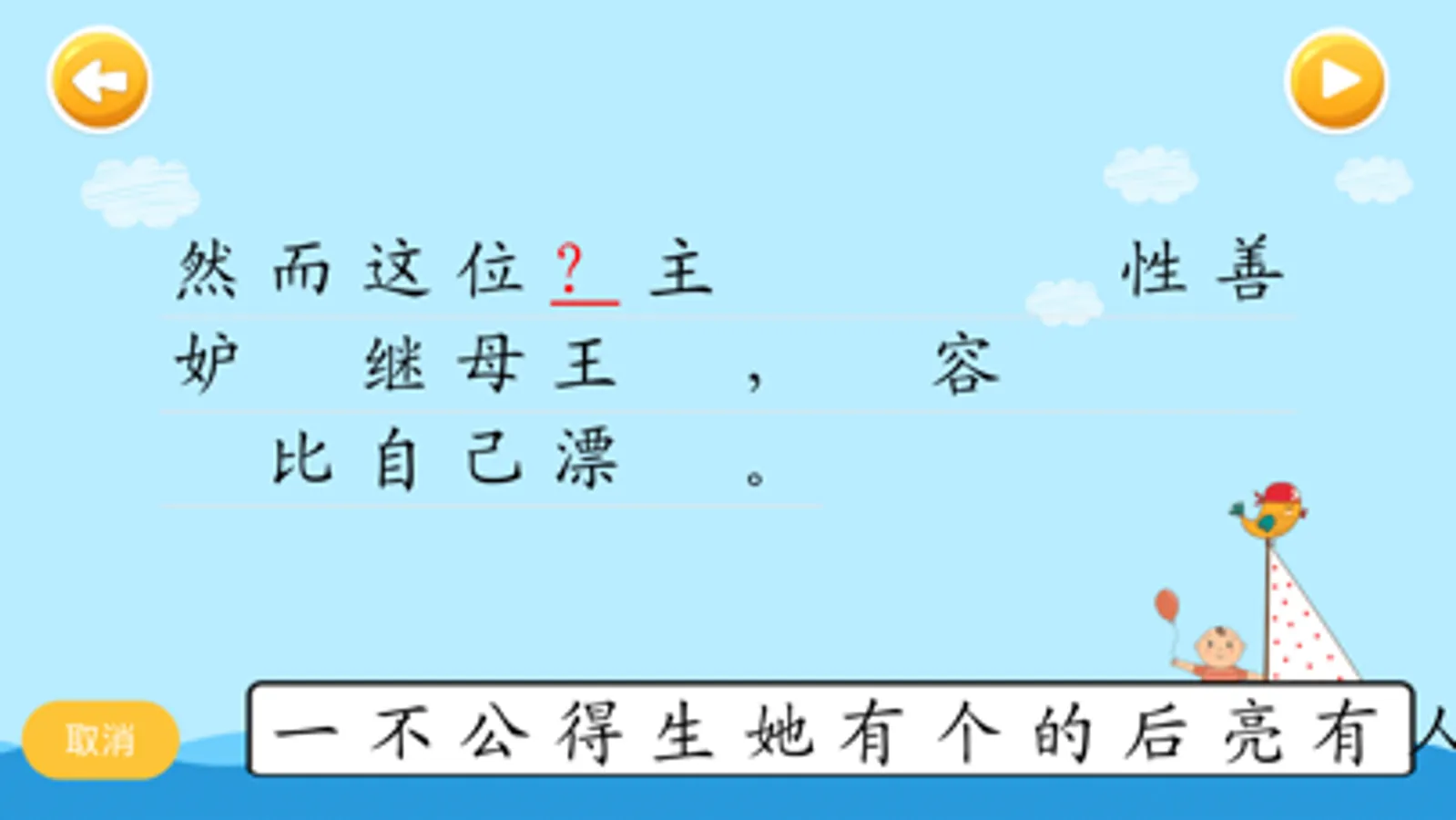 5、进阶填空练习:在所学词语、成语或是诗歌绘本中,在合适的位置填入之前所有学过的文字,达到巩固的效果,并使孩子对所学的词语、成语或是诗歌绘本有进一步认识,增强语文修养。