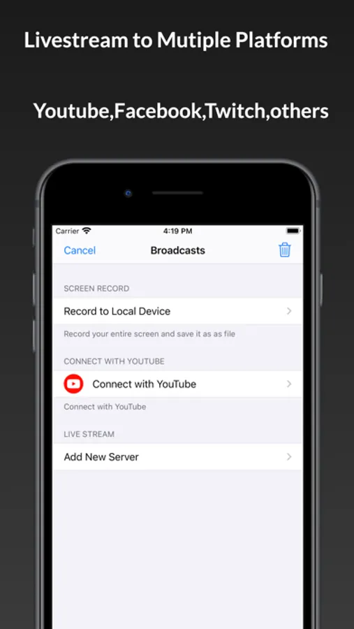 Add the screen recording feature to your control center. Simply log in to your YouTube, Facebook and Twitch account, choose the settings as you want, and start livestreaming to YouTube, Facebook and Twitch via the screen recording feature! These handy options give you a better livestreaming experience: