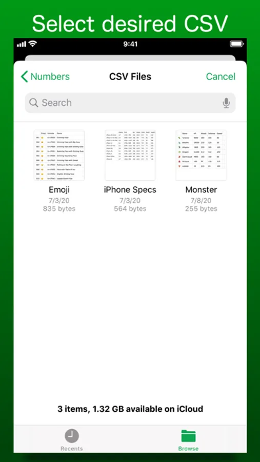 It is necessary for the user to create a CSV file in an external spreadsheet app, such as "Numbers", prior to importing into "CSV Keyboard".