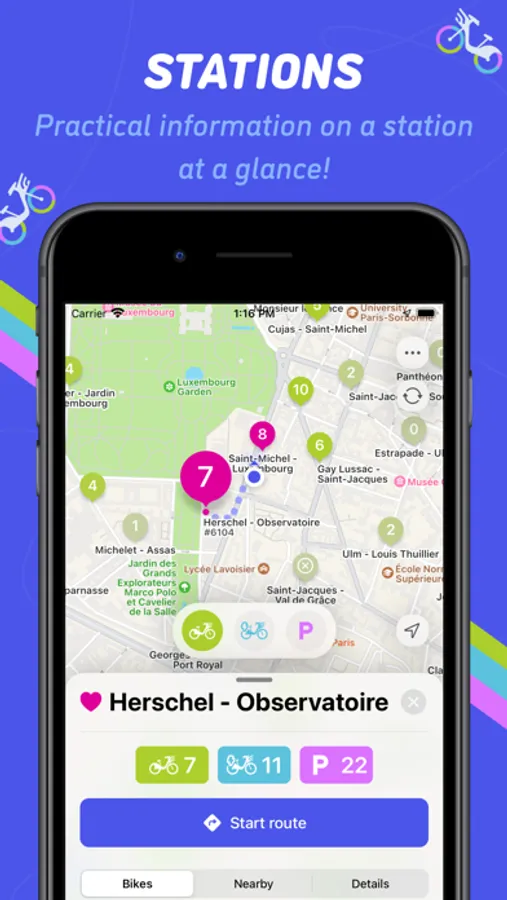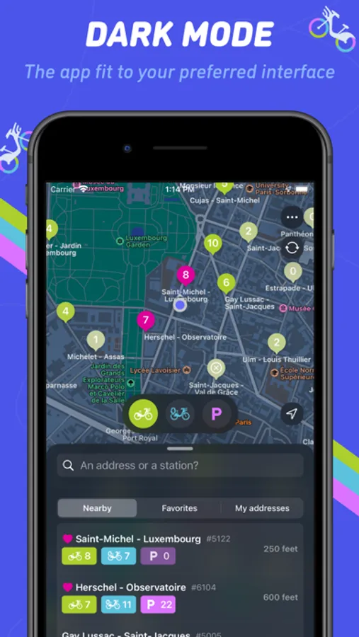 - Find the stations and the availability of mechanical, electric bikes or parkings on the map.