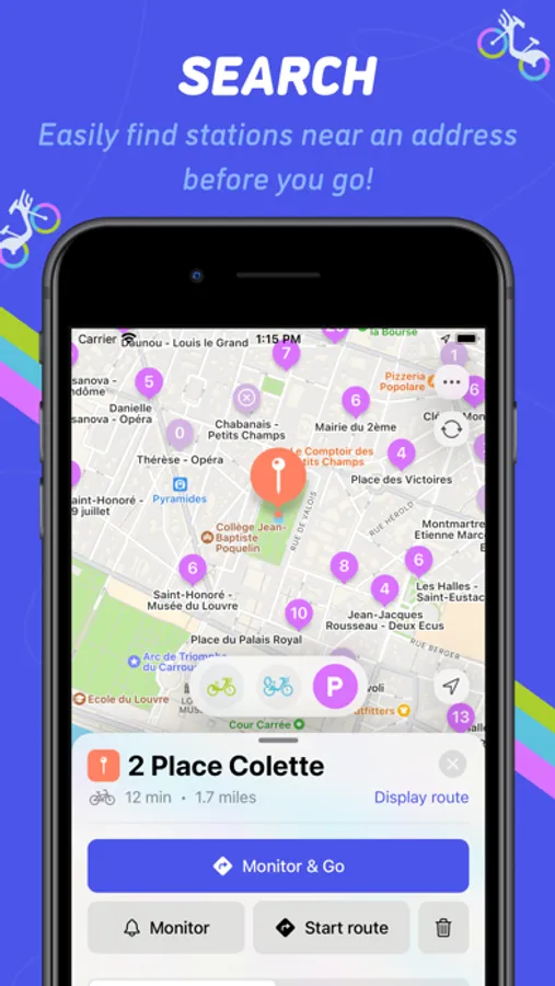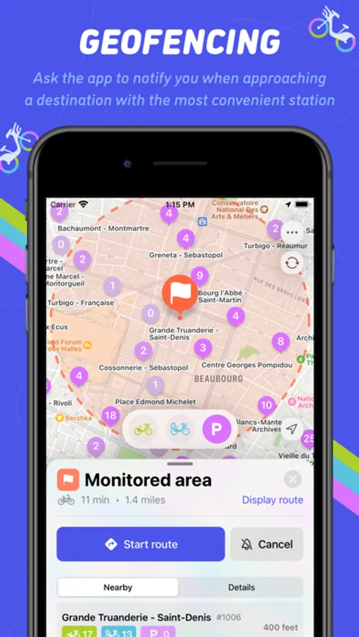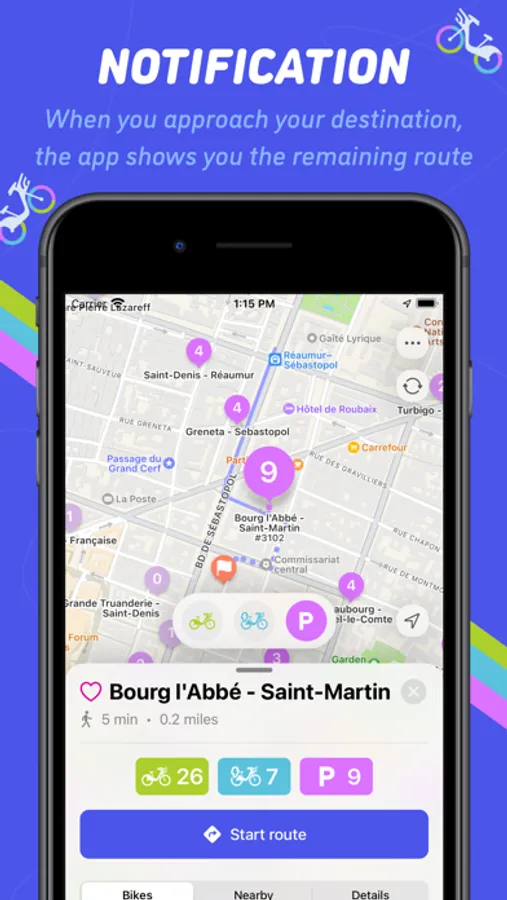 - Add an arrival point on the map and let the app take care of the rest. No more bothering to look for a station with available parking when you are there.