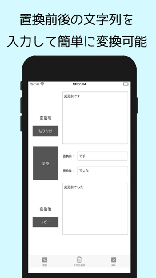 置換前文字列・置換後文字列を入力して、対象の文字列を置換することができます。