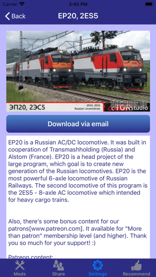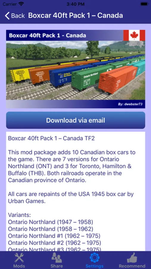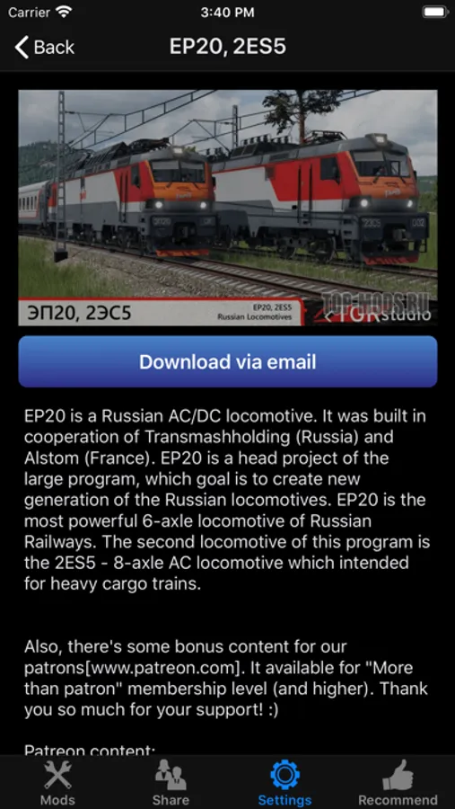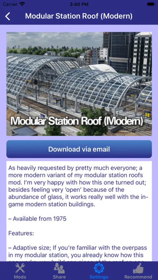 This app contains Mods of Transport Fever 2, all the mods can be downloaded from our server without further charge or periodic subscription. With the mods screenshots and descriptions, you will be able to find out whether the time and money needed is worth to backup the game, download and install the mods.