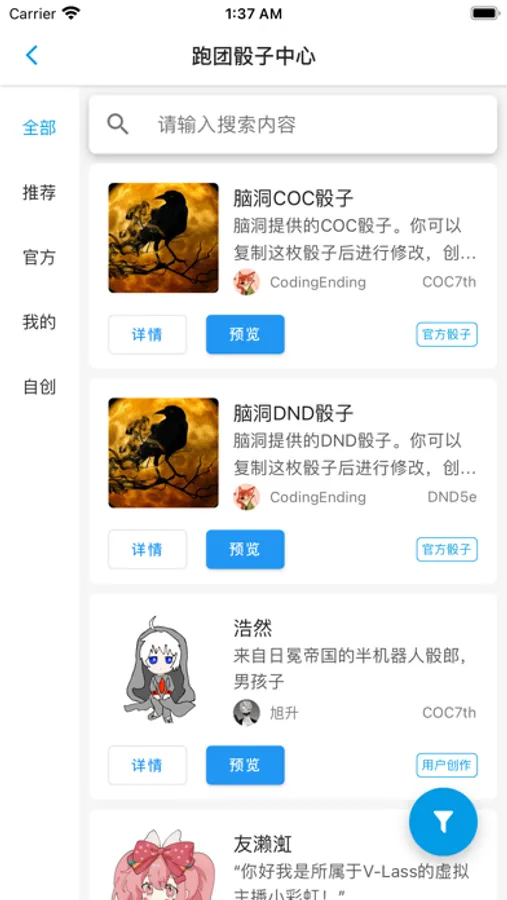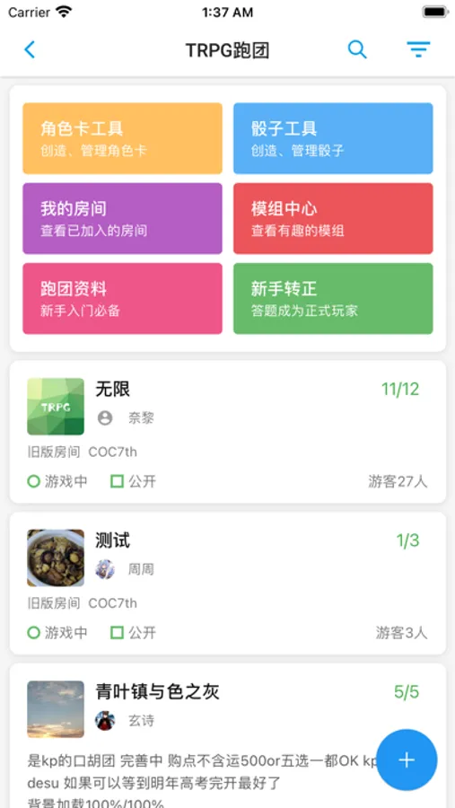 3.TRPG跑团:支持在线跑团,提供角色卡工具、模组、地图、线索板、背景音乐等辅助功能;