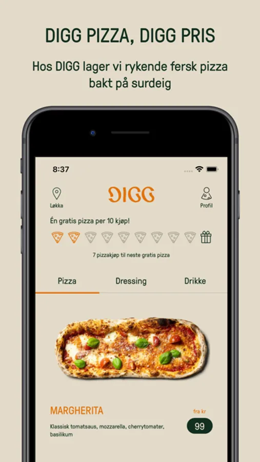 Hos DIGG lager vi rykende fersk pizza bakt på surdeig. Pizzaen er laget på råvarer nøye utvalgt av kokken og til en pris få andre kan matche.