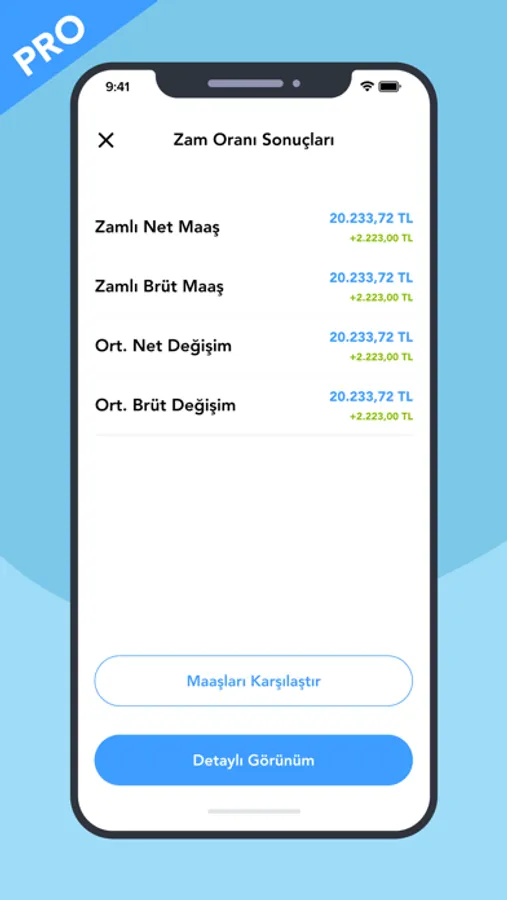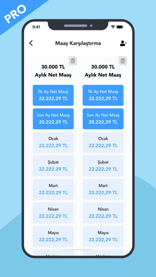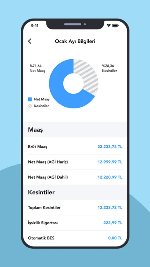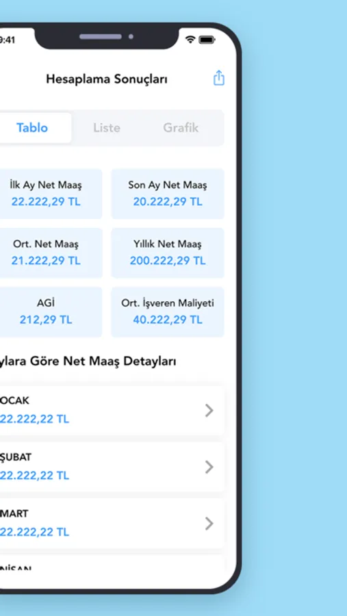 Maaş Hesaplama uygulamasında aylık maaşlarınızı farklı değişkenlerle hesaplayabilir, sonuçlarınızı liste, tablo ve grafik şeklinde gözlemleyebilirsiniz.