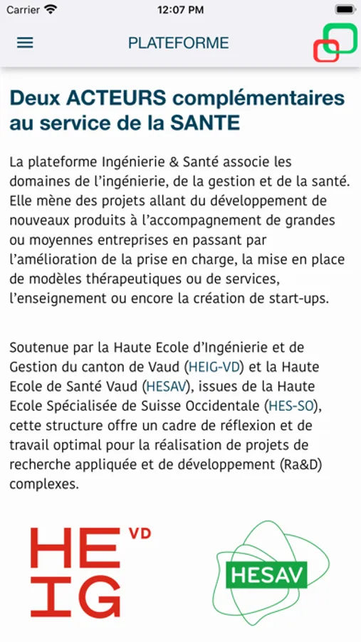 La plateforme Ingénierie-Santé est une collaboration entre la Haute École d’Ingénierie et de Gestion du canton de Vaud (HEIG-VD) et la Haute École de la Santé Vaud (HESAV) pour la recherche appliquée et l'enseignement.