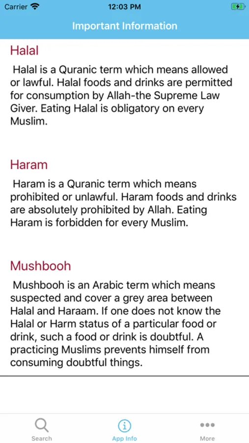 User can search his/her desired item in the app and can get the results, user is also facilitated to search the item though voice, and the app will get the result if the item is halal, haram or Mashbooh.