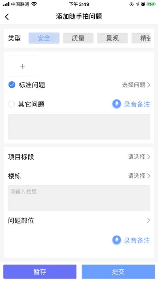 用于智能化工地安全和质量管理,为了提高效率性与便于管理等方面考虑而研发的一款APP,APP主要核心功能为便捷记录问题,及时指派给相关责任人员进行问题整改,上传处理结果,对问题进行闭环处理。例行巡检,是按照一定周期对工程进行检查,并将存在的安全、质量等类型的隐患问题开具整个通知,派送至相应责任单位进行处理,保障工地上处于安全状态。