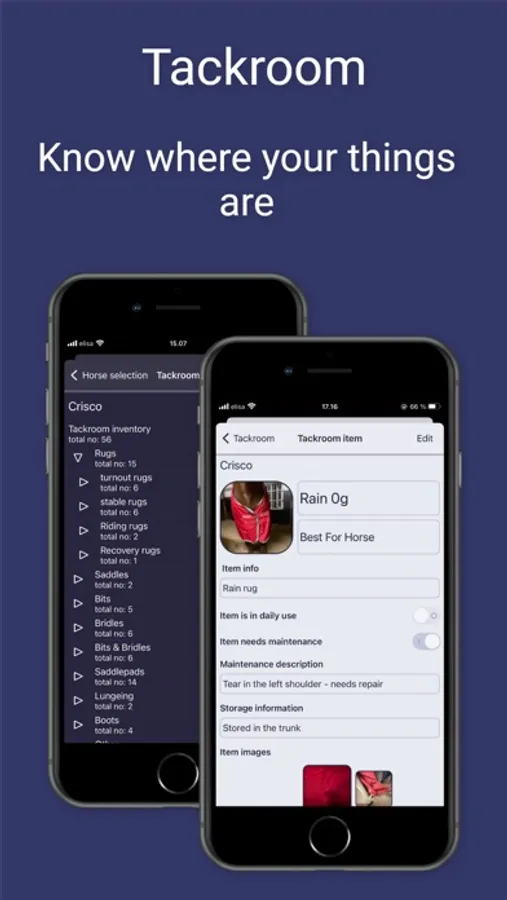 - see at glance which tack items have been used in trainings, are currently in use or need maintenance