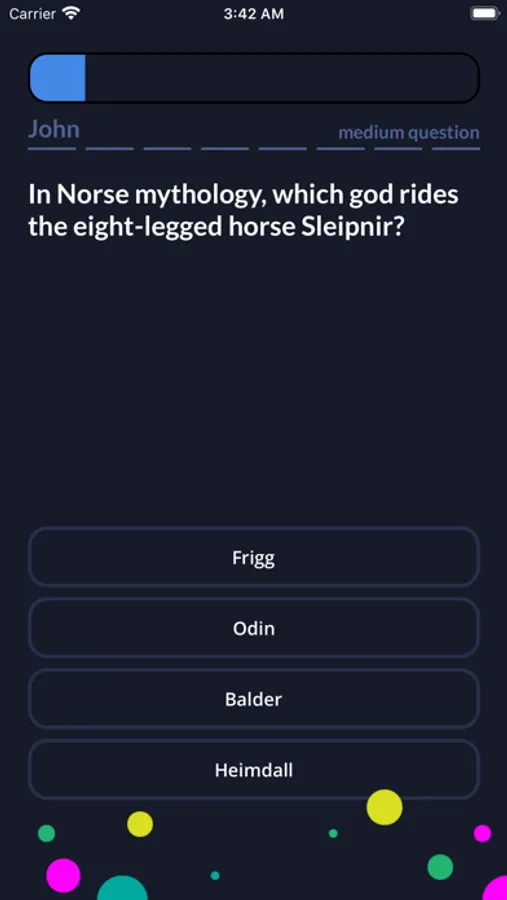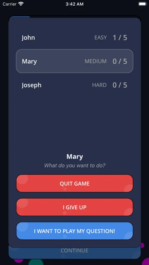 Add as many players you want. If there are weaker or stronger players in the group you can balance them out by giving them (on average) more difficult or easy questions. When all players are added, choose how many questions to answer correctly before someone wins. Each player now has to answer one question, then the next player follows, and so on. The game ends when one player reaches the number of correct answers required, or when everyone but one player has given up.