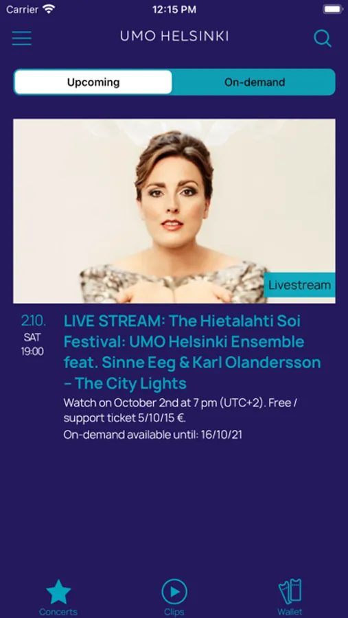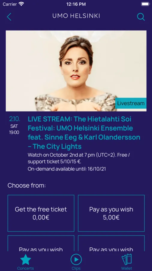 Downloading and using the application is free. Some of the online concerts will be chargeable, some of them free. The tickets to chargeable concerts can of course be bought via the app.