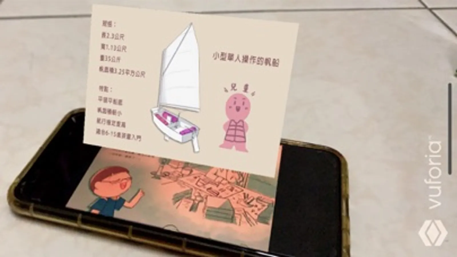 學生在學習過程中,以直覺的操作方式,手持智慧型行動載具直接掃描海洋教育OP帆船相關教材的資訊,即可呈現擴增實境學習內容。