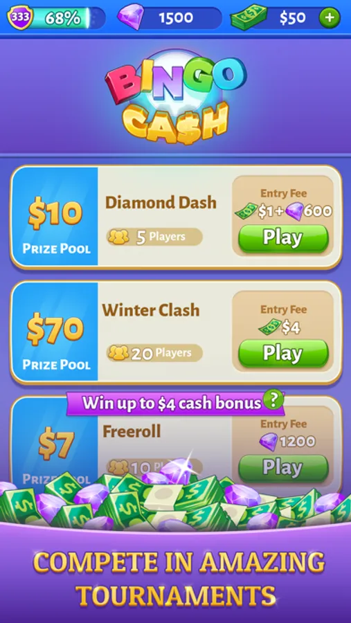 Bingo Cash™ is FREE to download and play! However, cash tournaments are not available in the following states: AZ, IA, LA & SC.