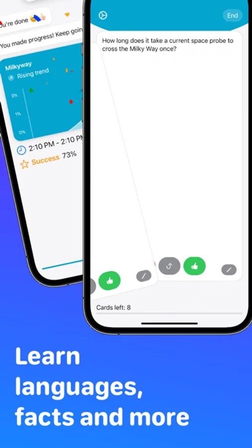 • Intuitive interface during each session. Swipe left to mark as unknown, swipe right to mark as known - and tap to see the answer.