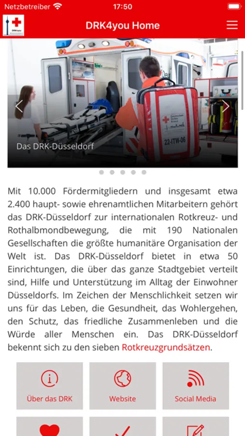 DRK4you ist die kostenlose App des DRK-Düsseldorf, mit der Sie sich immer und überall über die wichtigen Alltagshilfen, die Ihnen das Deutsche Rote Kreuz in der Landeshauptstadt bietet, informieren können. Seien Sie immer auf dem Laufenden, profitieren Sie als erster von wichtigen News, neuesten Videos, hilfreichen Links, Terminen & Events rund um Ihr DRK!