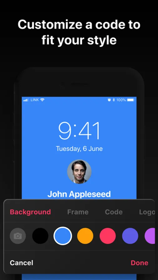 Change colors of background, code, and fonts with beautiful pre-set colors or set your own photo
