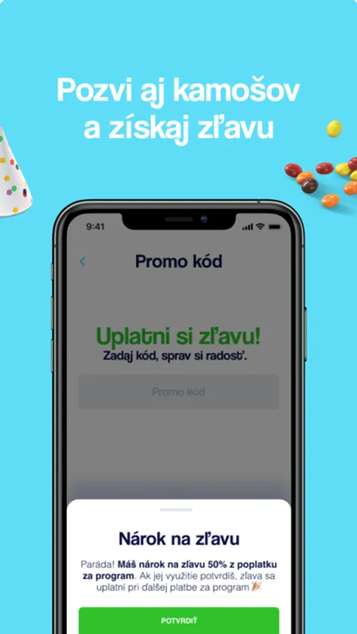 Každý rok dostaneš 5 promo kódov, ktoré môžeš poslať kamošom. Ak si ich uplatnia do 30 dní po aktivácii svojej novej Radosti a nechajú si ju dlhšie ako 7 dní, získaš za každého zľavu 50 % z najbližšieho poplatku za program. A oni všetci tiež.