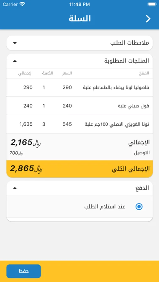 * حفظ الطلبات السابقة ليتم إعادة الطلب لها كاملاً أو لبعض عناصرها.