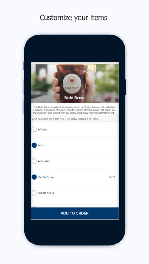 CUSTOMIZE - Add items to your order and customize your coffee just the way you like it. Your previous orders will be saved for next time!