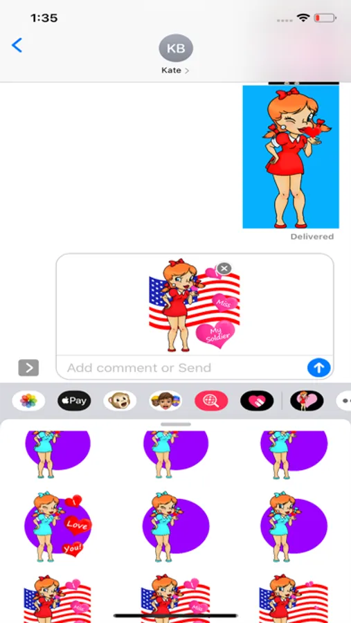 Decorate your texts with fun emojis of Honey Dee the All American Sweetheart! An adorable classic cartoon character that is reminiscent of Betty Boop. Perfect for letting that special someone know you love them. Download these beautiful creative I Love You stickers as images and animated GIFS for your iphone, ipad, and ipod. This character will light up your texts and add a loving touch to your daily chats with friends, family, and loved ones.