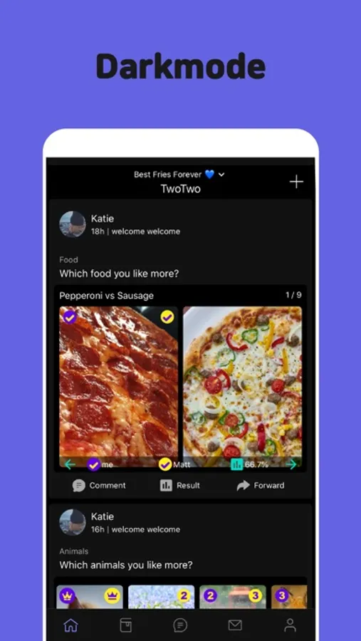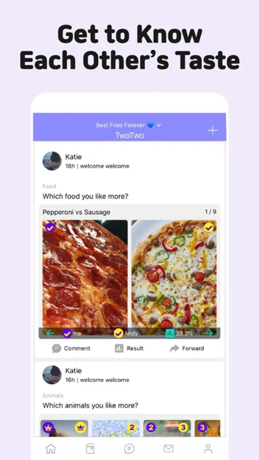TwoTwo is an app where you communicate with special people(boyfriend, girlfriend, crush, best friends, families, etc) and compare taste, thinking, and personality with them. Get close with them more by joining TwoTwo! Figure out what food they prefer and what they want for their birthday gift. It's also great to use when there is something going on between.