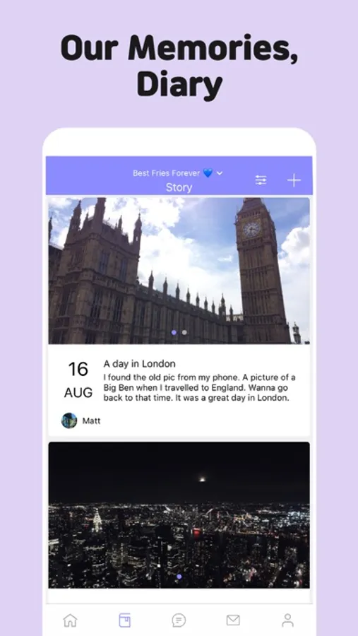 Upload your story and share your daily life and/or thinking. You also can upload an images. It can be a friendship diary with best friend or love diary with a beloved person. It's perfect to be used with family, too. Record precious and good memories about dates, hang out, anniversary, birthday, etc.