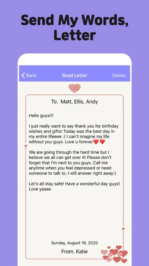 You can send a letters to people. Select multiple members or just one member to send letters with a love. Write beautiful words you couldn't say to them.