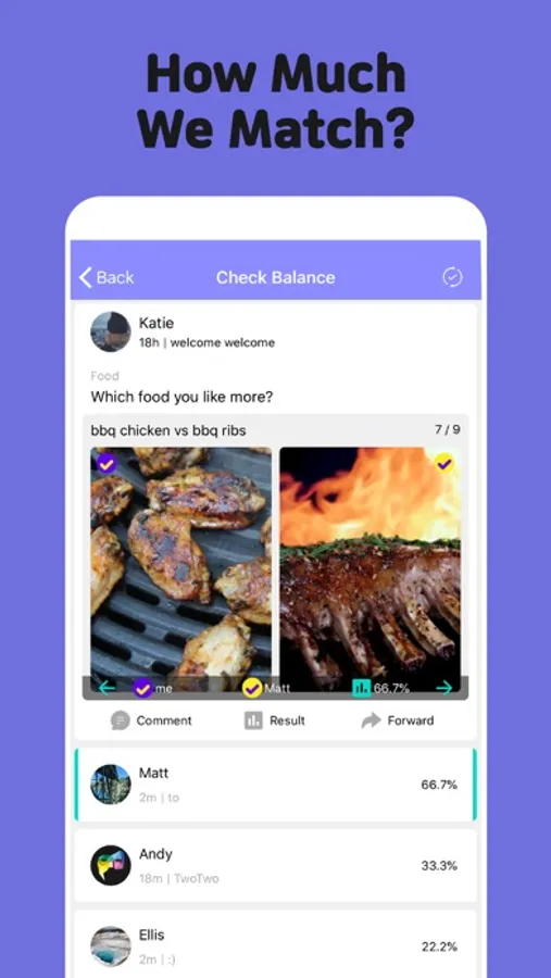 Choose better one from two cards and complete a Balance. You can compare the answer with a group members. Connect with members by checking each other's cards. Figure out matching percentage through participating games!