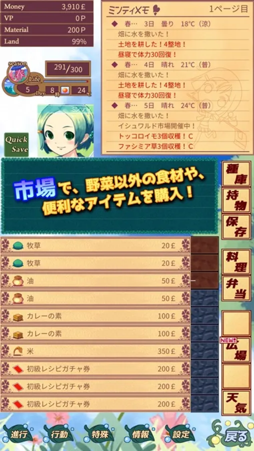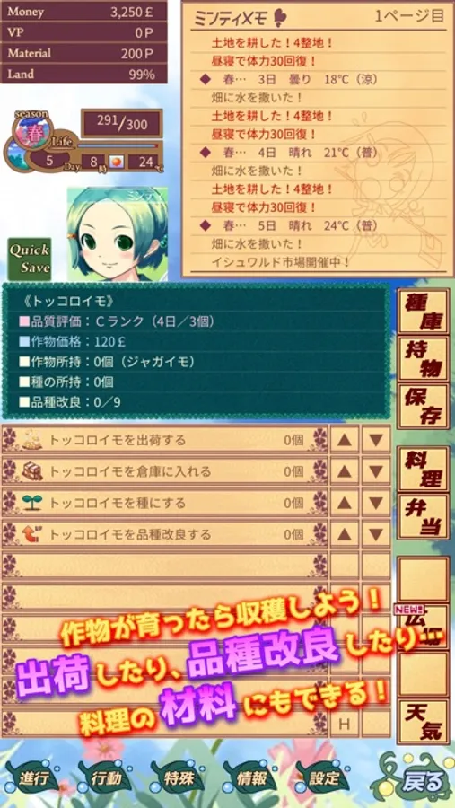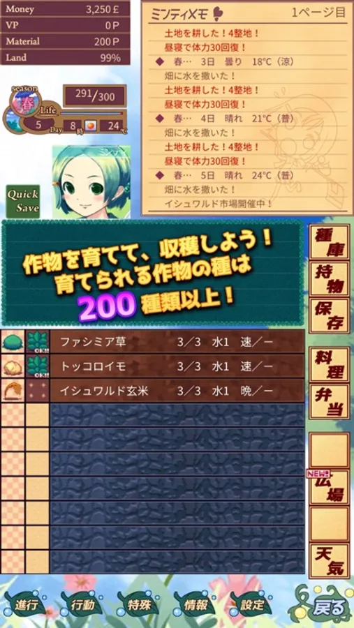育てられる作物の種類は200種類以上!育てた作物や他から採取した食材を用いて料理も可能!