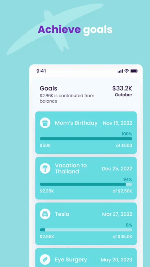 Like the journey of a thousand miles begins with a single step, building up savings begins with setting your goals. Aerial allows you to set an unlimited number of goals with deadlines, and track your progress.