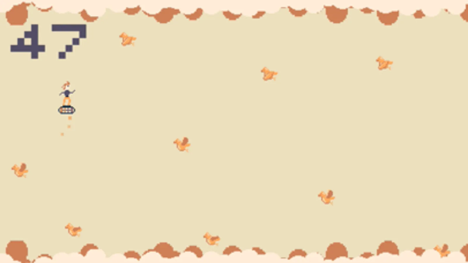 Fan Surfer is an endless runner style game. TOUCH the screen to activate your fan and navigate the your surfer to a NEW HIGH SCORE by dodging the birds and the clouds.