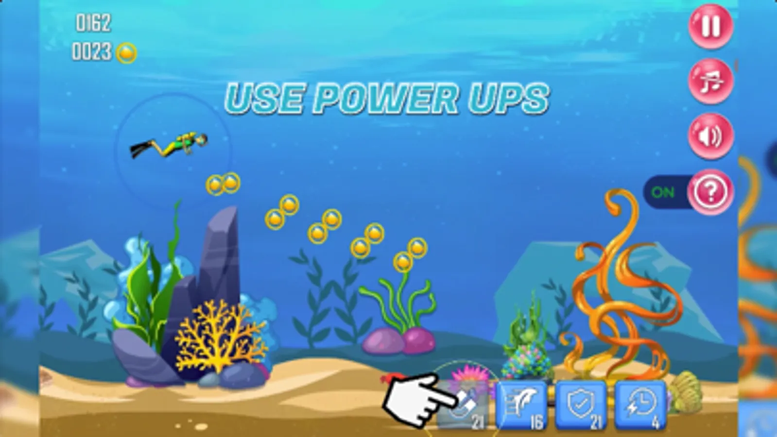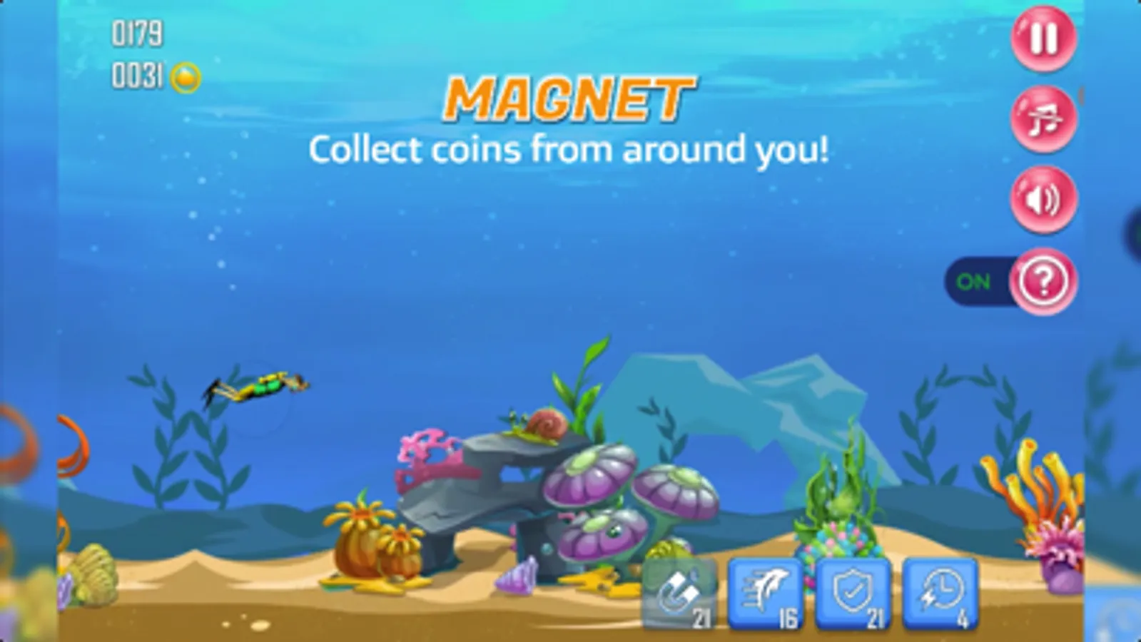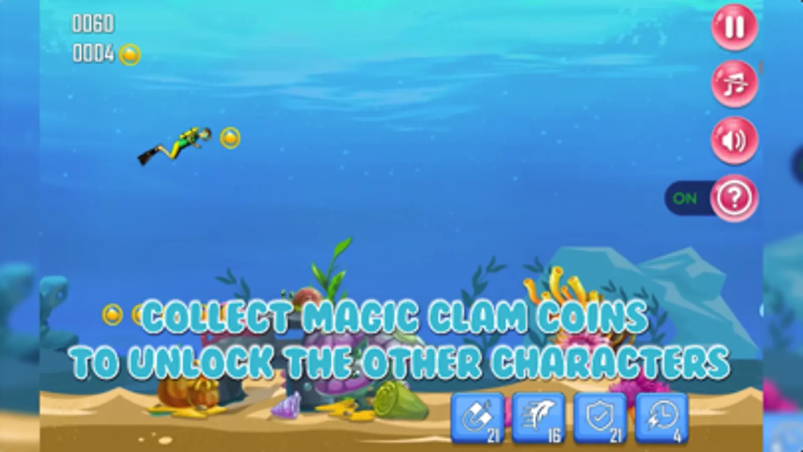 To start, drop in the cove as our heroes Jay, the boy genius, or his friend Oria, the snubfin dolphin. Swim and dive alone and gather magic clam coins. Collect power ups and strategize the right moment to unleash them. Calculate your moves on the dive, dodge mines and traps. Simply tap on the screen to ascend and release to descend your diver towards higher scores! Super easy to play, but it does get a little tricky.