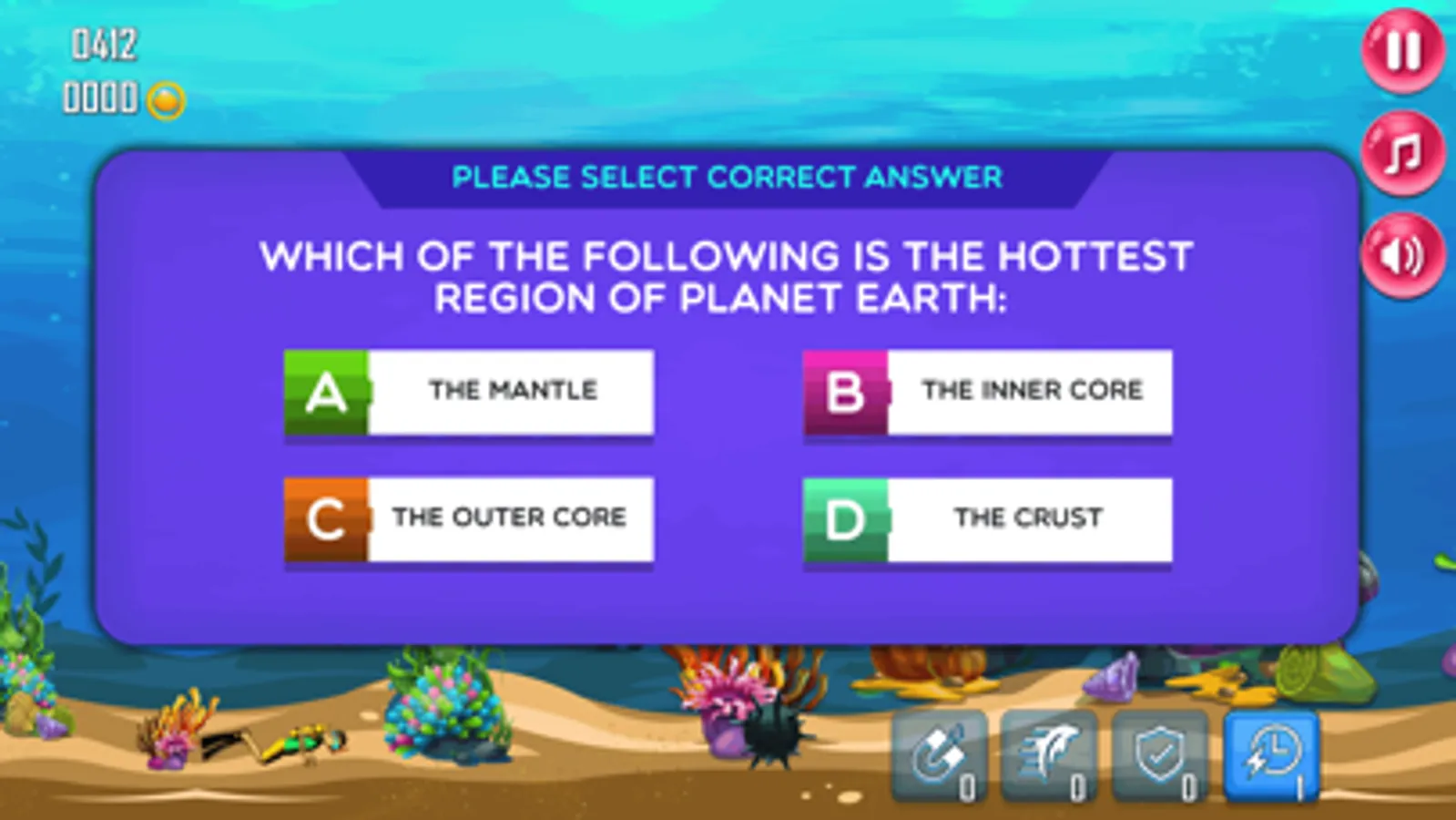 To unlock these other characters, collect as many coins as you can. Use coins to acquire Power ups like the Sonic Blast, Speed Burst, Energy Shield and Magnet. You can also use the trivia mode to win new power ups by answering trivia questions. Throughout each game you'll collect coins and complete challenges. Keep your eye out for Fang and this crazy speeding turtle named Mr. Bubbles. See how much of the cove you can swim and dive and beat up on your friends on leaderboards!