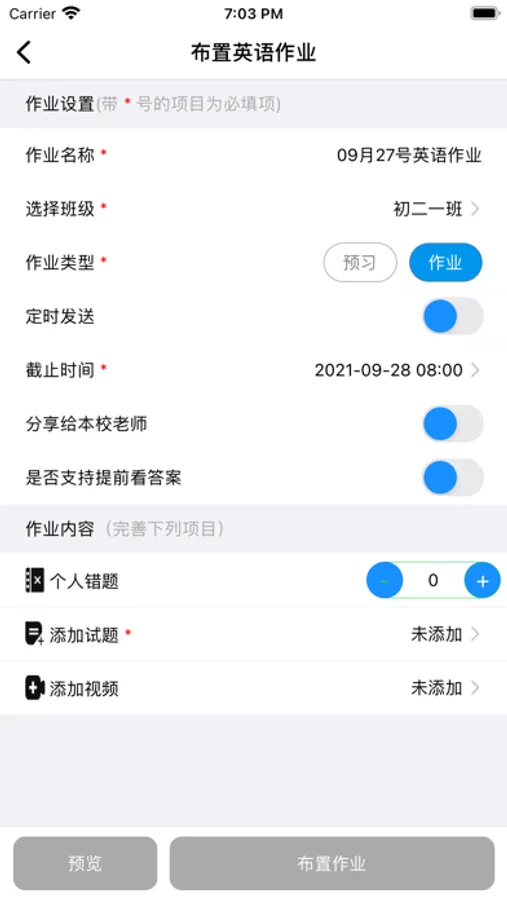 2、教学资料系统:根据年级、教材、学生错题三种类型题,组成习题资料,并且可以根据班级分组,针对性的作为作业或预习发布给学生。